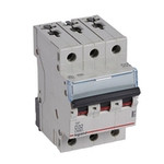 Legrand Leitungsschutzschalter TX3 nach EN 60898-1, VDE 0641-11, EN 60947-2, 3-polig, D-Charakteristik, Bemessungsstrom In 32 A, Bemessungsschaltvermögen Icn 6 kA nach EN 60898-1, Bemessungsspannung Un 400 VAC, Bemessungsfrequenz 50/60 Hz, Energiebegrenzungsklasse 3, Befestigung auf Hutprofilschiene EN 60715 durch eine rastende Schnellbefestigung, klare Information vorne auf jedem Gerät, eindeutige Schaltstellungsanzeige rot/grün am Schalthebel, mit Beschriftungsfenster, mit Untersteckschutz zum sicheren Einführen des Leiters in Fahrstuhlklemme, Anbau von Hilfsgeräten möglich. Leitungsschutzschalter mit D-Charakteristik sind für den Leitungsschutz in Kraftstromkreisen mit sehr hohen Einschaltströmen vorzusehen (z.B. Schweißtrafos).