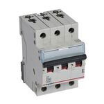 Legrand Leitungsschutzschalter TX3 nach EN 60898-1, VDE 0641-11, EN 60947-2, 3-polig, D-Charakteristik, Bemessungsstrom In 50 A, Bemessungsschaltvermögen Icn 6 kA nach EN 60898-1, Bemessungsspannung Un 400 VAC, Bemessungsfrequenz 50/60 Hz, Energiebegrenzungsklasse 3, Befestigung auf Hutprofilschiene EN 60715 durch eine rastende Schnellbefestigung, klare Information vorne auf jedem Gerät, eindeutige Schaltstellungsanzeige rot/grün am Schalthebel, mit Beschriftungsfenster, mit Untersteckschutz zum sicheren Einführen des Leiters in Fahrstuhlklemme, Anbau von Hilfsgeräten möglich. Leitungsschutzschalter mit D-Charakteristik sind für den Leitungsschutz in Kraftstromkreisen mit sehr hohen Einschaltströmen vorzusehen (z.B. Schweißtrafos).
