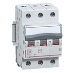 Legrand Lasttrennschalter DX3, 3-polig, 63A 400 VAC, nach EN 60947-3, EN 60669-2-4. Gebrauchskategorie AC-22A. Befestigung auf Hutprofilschiene EN 60715 durch rastende Schnellbefestigungen, klare Information vorne auf jedem Gerät, eindeutige Schaltstellungsanzeige rot/grün am Schalthebel (verriegelbar), mit Beschriftungsfenster, einpolig verschienbar mit Legrand Stiftkammschienen, Anbau von Hilfsgeräten möglich.
