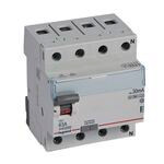 Legrand Fehlerstromschutzschalter TX3, Typ F-G, Mischfrequenzsensitiv nach EN 62423, VDE 0664-10, EN 61008-1, G nach ÖVE E8601, kurzzeitverzögert, verzögert mindestens 10 ms, 4-polig, Bemessungsstrom In 63 A, Bemessungsfehlerstrom Idn 30 mA, Bemessungsspannung Un 400 VAC, Bemessungsfrequenz 50 Hz, Stoßstromfest bis 3000 A, Bemessungskurzschlussstrom 10 kA bei geeigneter Vorsicherung, Befestigung auf Hutprofilschiene EN 60715 durch rastende Schnellbefestigungen, klare Information vorne auf jedem Gerät, eindeutige Schaltstellungsanzeige rot/grün am Schalthebel, mit Beschriftungsfenster, mit Untersteckschutz zum sicheren Einführen des Leiters in Fahrstuhlklemme, Anbau von Hilfsgeräten möglich.