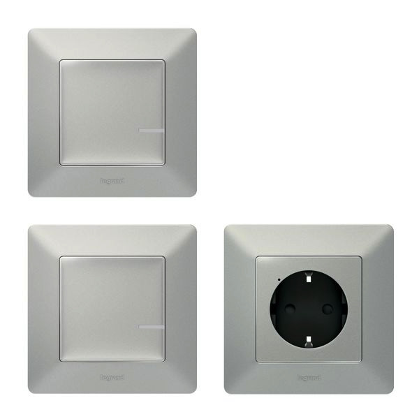Vernetztes Erweiterungspaket von "Valena Life with Netatmo" - Zum Erstellen einer drahtlosen Wechselschaltung für die Erweiterung eines Starterpakets.Inhalt:- 1 schaltbare Funk-Steckdose 16 A (3680 W) mit integrierter Sicherung gegen Überlast. Die Steckdose dient zum Schalten von elektrischen Verbrauchern (z.B. Stehlampen, Haushaltsgeräte, etc.) und misst außerdem den aktuellen und gesamten Stromverbrauch. Des Weiteren können konfigurierbare Nachrichten bzgl. Verbrauch oder Fehlermeldung versendet werden. Sie ist kompatibel mit allen Elektrogeräten, und besonders für großeHaushaltsgeräte hervorragend geeignet. Kann gegen eine bestehende 1-fach Steckdose getauscht werden. Die Montage erfolgt mittels Schrauben oder Spreizkrallen in eine 1-fach Standard-Unterputz- oder Hohlwanddose mit Tiefe 40 mm. Automatische Steckklemmen. Konfigurierbare LED-Anzeige als Beleuchtungsfunktion. Auslieferung inkl. Abdeckrahmen.- 1 Funk-Wandsender Licht zum Steuern von Funk-Steckdosen und/oder Funk-Lichtschaltern. LED-Anzeige für Batteriestatus. Ausgestattet mit einer 3 V-Batterie CR2032 (Standby-Lebensdauer: 8 Jahre) und 4 wiederverwendbare Klebestreifen zur Befestigung des Wandsenders auf jeder Oberfläche. Dieser kann auch direkt an der Wand oder an eine Installationsdose geschraubt werden. Auslieferung komplett mit Wippe, Abdeckrahmen und Staubschutzabdeckung.- 1 Funkschalter Licht mit Dimmer-Option für 5 – 300 W ohne Neutralleiter-Anschluss. Die Dimmerfunktion wird mit der App Home + Control aktiviert. Durch den mitgelieferten Kompensator (Best.nr. 040149) ist der Schalter/Dimmer kompatibel mit allen Lasten (bei LEDs: dimmbare Varianten werden empfohlen). Kann gegen einen bestehenden herkömmlichen Schalter getauscht werden. Die Montage erfolgt mittels Schrauben oder Spreizkrallen in eine Standard-Unterputz- oder Hohlwanddose mit Tiefe 40 mm. Konfigurierbare LED-Anzeige als Beleuchtungsfunktion. Auslieferung komplett mit Wippe, Abdeckrahmen und Staubschutzabdeckung.Ausführung: Valena Life in der Farbe Aluminium