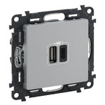 2-fach USB-Ladesteckdosen 1xTyp C und 1xTyp A, USB-C-Stecker, lassen sich beidseitig einstecken, z. B. zum Laden von Smartphones, MP3-/MP4-Player und Tablets. Ausgangsspannung 5 V mit maximalem Ladestrom von Typ C 3000 mA bei einem Gerät oder 1500 mA pro Ausgang bei gleichzeitigem Laden von 2 Geräten; Schraubklemmenanschluss: 230 V~, 15W, Verbrauch im Standbymodus 0,075W, geliefert inkl. Abdeckung, Ladekabel nicht im Lieferumfang enthalten. Farbe: Aluminium