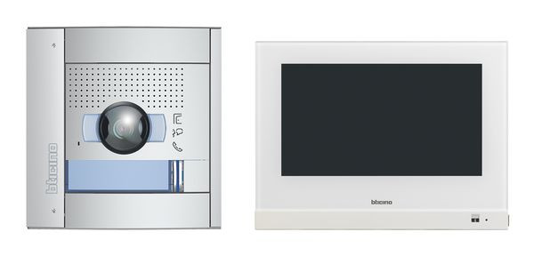Flex’ONE Video-Set mit Türstation SFERA und Hometouch 7“Das Set in 2-Draht-Technik enthält alle benötigten Teile zur Realisierung einer Einfamilienhaus-Sprechanlage. Die Erweiterung auf ein Zweifamilienhaus erfolgt durch das Hinzufügen einer 2. Hausstation nach Wahl. Das Set besteht aus:- 1 Unterputz-Türstation SFERA in der Ausführung Allmetal. Wird mit 2 Frontblenden (1 und 2 Ruftasten) ausgeliefert und kann somit als Ein- oder Zweifamilienhaus konfiguriert werden. Ausgestattet mit Farbkamera mit 1/3“-Sensor (Bildbereich 135° horizontal/96°vertikal) inkl. LEDs zur Beleuchtung des Aufnahmebereichs und Antibeschlag-Heizung (Heizwiderstand). Namensschild inkl. Integriertem Helligkeitssensor zum automatischen Einschalten der Hintergrundbeleuchtung (weiße LEDs) bei Dunkelheit. Status-LEDs für die Betriebszustände: Tür offen, Kommunikation aktiv, Ruf getätigt und System besetzt. Der Türöffner (max. 30 Ohm Innenwiderstand) wird direkt an die Klemmen S+ und S– (18 V, 4 A Stoßstrom, 250 mA Haltestrom) angeschlossen. Schutzart IP 54, Schlagfestigkeit IK 08; Abmessungen: B × H: 138 × 144 mm; Farbe: ähnlich RAL 9018- 1 Video-Netzgerät- 1 Zusatzspannungsversorgung für Hometouch 7“- 1 Hometouch in der Farbe weiß mit 7" Bildschirm und kapazitiver Touch-Oberfläche zur Verwendung als Video-Hausstation mit integrierter Smartphone-Anbindung. Die dafür notwendige App "Door Entry for Hometouch" für iOS und Android ist kostenlos im jeweiligen Online-Store erhältlich und ermöglicht die komplette Funktionalität einer Videohausstation (Sprechen, Videobild, Abrufen von externen Kameras, etc.). Der Hometouch verfügt über eine physische Taste zum Türöffnen, einen Annäherungssensor und über eine eindeutige LED-Signalisierung. Die Anbindung an das Heimnetzwerk ist mittels LAN oder WLAN möglich. Zusätzlich fungiert er (nur in Verbindung mit Server Best.Nr. MYHOMESERVER1) als Steuerzentrale der My-Home-Hausautomation (Licht- und Rollladen steuern, Heizung, Beschallung, Szenarien abrufen, etc.). Anschlüsse: 1 x BUS MyHOME, 1 x BUS Sprechanlage, 1 x Zusatzversorgung, 1 x RJ45, 1 x WiFi-Anbindung Abmessungen bei Aufputzmontage (B × H × T): 196 × 147 × 24 mm (zur Unterbringung der Anschlusskabel wird eine Standard UP-Dose empfohlen). Bei Verwendung der Unterputzdose Best.Nr. 3487 beträgt die Aufbauhöhe lediglich 7 mm, keine zusätzlichen Abdeckrahmen notwendig.- Schaltplan und Bedienungsanleitungen