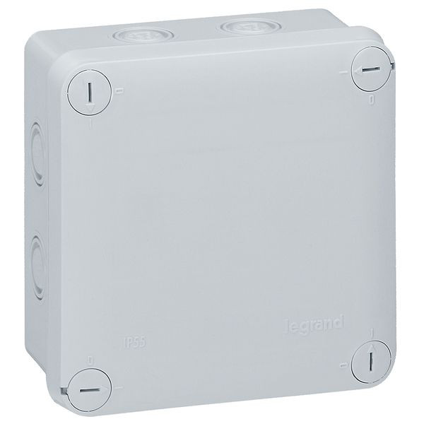 Legrand Abzweigdose Plexo, Quadratisch 105 x 105 x 55 mm (H x B x T), Schutzart IP 55 – IK 07, mit Vorprägung für metrische Leitungseinführung, Deckel mit 1/4-Drehung Schnellverschluss, Lichtgrau RAL 7035, selbstverlöschend 650°C, Beschriftbarer Deckel.