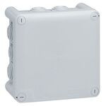 Legrand Abzweigdose Plexo. Qadratisch 130 x 130 x 74 mm (H x B x T), Schutzart IP 55 – IK 07, 10 Membran-Einführungen, Deckel mit 1/4-Drehung Schnellverschluss, Lichtgrau RAL 7035, selbstverlöschend 750°C, beschriftbarer Deckel.