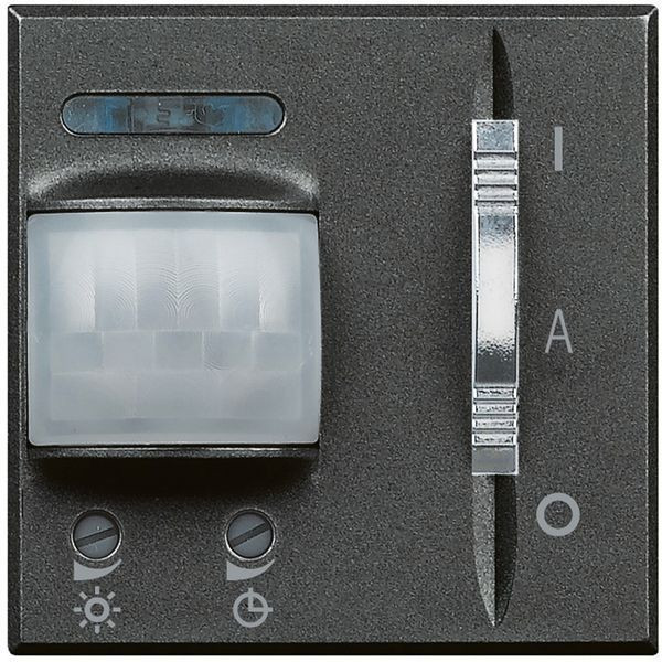 Passiv-Infrarot-Bewegungsmelder mit justierbarer Helligkeit und Abfallverzögerung von 30 Sekunden bis 10 Minuten, frontseitiger Schiebeschalter „Ein?/?Aus?/?Automatik“ – Schließerkontakt 6?A (ohmsch) Stromversorgung 230?V a.c. (3-Leiteranschluss), Eingang für ext. Steuerkontakt – 2-modulig, Farbe: Anthrazit