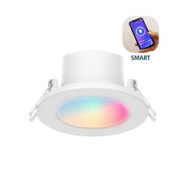 SMART-Einbaustrahler, 6W, max. 600lm, IP65 für Innen, Außen, und Feuchtraum geeignet, Gehäusematerial: Korrosionsfreier Kunststoff, Gehäusefarbe: Weiß RAL9016, Lichtfarbe von 2700K bis 6500K und in RGB einstellbar, mit eingebautem SMART-Netzteil, mit Smart Life APP steuerbar, Deckenausschnitt: 68mm, Geringe Einbautiefe: 44mm, Ausstrahlungswinkel: 100°, CRI>80, flackerfrei, Dimmbar: Ja. Phasenan- /abschnitt, Steckklemme: 4 pol., Anschlussleistung: AC220-240V, 50-60Hz, Optik von Dekoringen modifizierbar