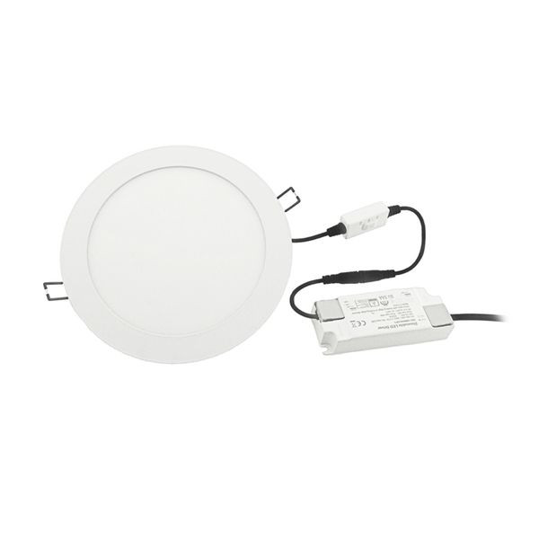 Einbauleuchte, extrem flache Bauform, geringe Einbautiefe, 12W, max. 840lm, IP44, Gehäusematerial: Aluminium, Gehäusefarbe: Weiß RAL 9016, Lichtfarbe in 3000K/4000K/5700K einstellbar, mit externem Netzteil, Ausstrahlungswinkel: 120°, CRI>80, Dimmbar: Ja, Phasenan-/ abschnitt, Anschlussleistung: AC180-230V, 50Hz, Abmessung: ø170x21, Deckenausschnitt: ø155-160, Lebensdauer: >40.000 Std