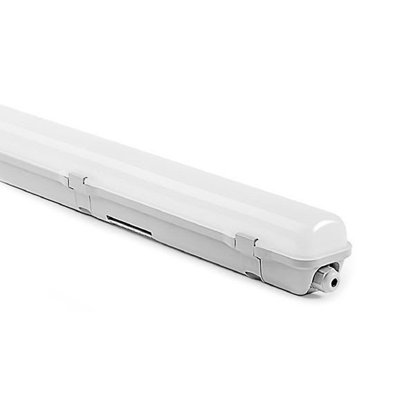 Feuchtraumleergehäuse für 1 Tube, klare Abdeckung, 1200mm, als Ersatz für 36W, Schutzart IP65, Stoßfestigkeitsgrad IK08, Ober- und Unterteil aus schlagfestem Polycarbonat, Edelstahlklammern, mit 5-poliger Anschlussklemme für Durchgangsverdrahtung