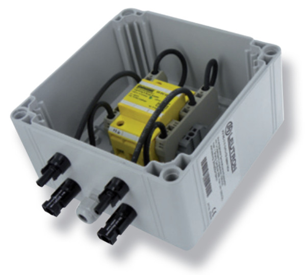 Generatoranschlusskasten für maximal einen String für einen MPP-Tracker, mit MC4 Steckverbindern. Im AP-Gehäuse (200 x 200 x 132 mm) / IP66 Eingang / Ausgang: Parallelschaltung von einem String. Kombiableiter Typ1+Typ 2 mit 1000 V