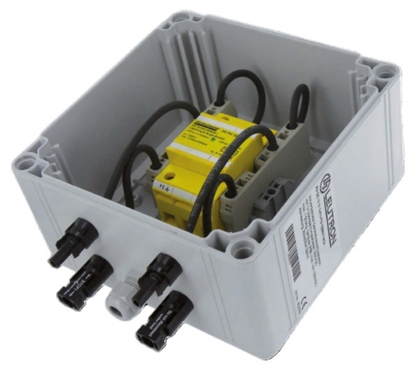 Generatoranschlusskasten für maximal einen String füreinen MPP-Tracker zum Schutz einesWechselrichter mit einem MPP-Tracker.AP-Gehäuse, IP 66 und UV-beständigEingang / Ausgang: 1 String Eingang / 1 String Ausgang pro MPP-TrackerKabeldurchführungen: 1x M16, 4x MC4Querschnitt Ein- und Ausgangsklemme: PE 16 mm²SPD-Typ (nach EN 61643-11): Typ 2 / class IISystemspannung, UocSTC max.: 1000 V DCmax. Nennstrom je Eingangsklemme (+): 35 ADCmax. Nennstrom je Ausgangsklemme (-): 35 ADCGehäuseabmessungen B x L x T: 200 x 200 x 132 mm