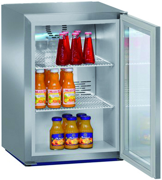 mechanische Steuerung, dynamische Kühlung (Umluft), Temperaturbereich +2 bis +12°C, automatische Abtauung, separat schaltbare und stufenlos dimmbare LED-Deckenbeleuchtung, 3 Ablageflächen, davon 2 metallisierte, transparent pulverbeschichtete Roste verstellbar, Belastbarkeit je Ablagefläche 30 kg, Isolierglastür mit Schloss, Türanschlag rechts