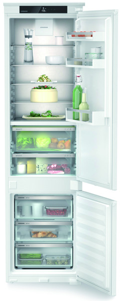 Kühlteil: PowerCooling mit FreshAir-Aktivkohlefilter, SuperCool, LED-Deckenbeleuchtung, 5 Abstellflächen, davon 4 höhenverstellbare GlassLine-Abstellflächen, davon 1 teilbar, integrierte Flaschenablage, Platz für Backblech,