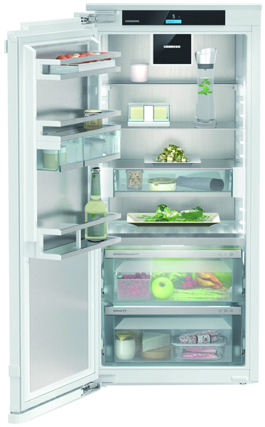 2,4“ TFT-Display farbig mit Touch & Swipe-Elektronik, Warnsignal optisch und akustisch bei Störung:, Türalarm optisch und akustisch, inkl. SmartDevice-Box, PowerCooling mit Ambilight mit FreshAir-Aktivkohlefilter, SuperCool, Rückwand und Türpanel in Edelstahl mit SmartSteel, LED-Lichtpanel beidseitig, 4 Ablageflächen, davon 3 höhenverstellbare GlassLine-Abstellflächen, davon 1 teilbar, 1 VarioSafe Schublade, integrierte Flaschenablage, 2 BioFreshProfessional mit LED-Beleuchtung auf Teleskopschienen ausziehbar mit Vollauszug, Selbsteinzug und Dämpfung, davon 1 Fruit & Vegetable-Safe mit HydroBreeze und 1 Meat & Dairy-Safe, 1 FlexSystem, Türanschlag links, AutoDoor (Öffnen per Klopfsignal oder Sprachbefehl), Soft-System-Schließdämpfung