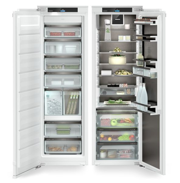 Side-by-Side Set (auch als Einzelgeräte nutzbar), integrierbar, Rauminhalt Kühlen: 296 l, davon Frische-Zone: 97,9 l, HydroBreeze (der kalte Nebel, verbunden mit der Temperatur im Safe um 0°C, gibt Lebensmitteln den Extra-Kick für längere Haltbarkeit ), Super-Kühlen, Umluftkühlung, Flaschenablage (liegend), Frische-Behälter: 3, Glasablageflächen: 6, VarioSafe (Kleinere Lebensmittel, Packungen, Tuben und Gläser sind in diesem Schubfach optimal aufbewahrt), LED-Beleuchtung, Rauminhalt Gefrieren: 213 l, Schubladen: 8, VarioSpace (einzelne Gefrierschubfächer herausnehmbar, für extra hohen Stauraum), NoFrost, Super-Gefrieren, LED-Beleuchtung, Eisbereiter für Eiswürfel, Display, farbig, 2,4 Zoll, 6,1 cm, Touch-Funktion, digitale Temperaturanzeige, Kühl-/Gefrierteil getrennt regelbar, SmartDevice integriert (Steuerung über Internetverbindung möglich), per App unterstützter Datentransfer, per App steuerbar, Energieeffizienzklasse D, Made in Germany