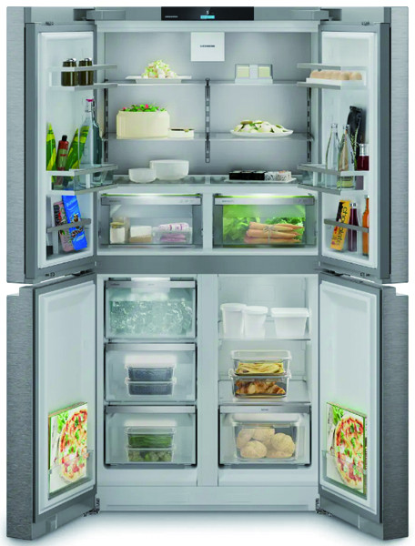 Kühlteil: PowerCooling mit FreshAir-Aktivkohlefilter, SuperCool, Rückwand SmartSteel-Look, LED-Deckenbleuchtung, 5 GlassLine-Abstellflächen, davon 4 höhenverstellbar, integrierte Flaschenablage,