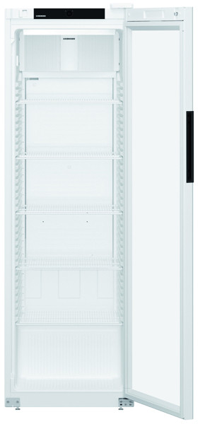 Temperaturanzeige innen analog, dynamische Kühlung, Temperaturbereich +2 bis +9°C, automatische Abtauung, LED-Deckenbeleuchtung, 6 Ablageflächen, davon 5 verstellbare kunststoffbeschichtete Roste mit Auszugsstopp und Begrenzugsstab vorne, Belastbarkeit je Ablagefläche 45 kg, selbstschließende Isolierglastür mit Schloss, Türanschlag rechts, wechselbar