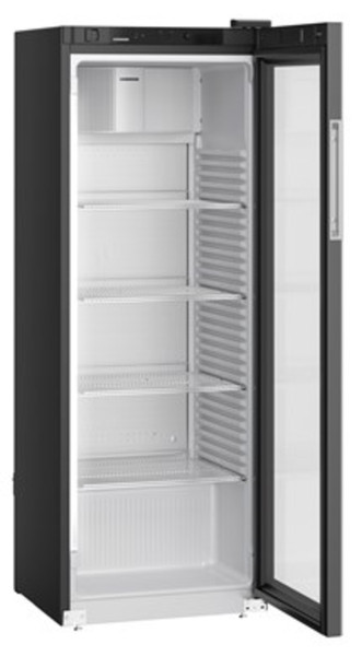 Temperaturanzeige außen digital, dynamische Kühlung, Temperaturbereich +1 bis +15°C, automatische Abtauung, LED-Lichtsäule links, 5 Ablageflächen, davon 4 verstellbare metallisierte, transparent pulverbeschichtete Roste, Belastbarkeit je Ablagefläche 45 kg, selbstschließende Isolierglastür mit Schloss, Türanschlag rechts, wechselbar