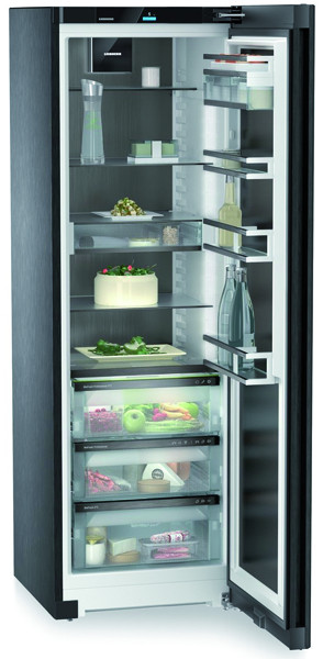 2,4“ TFT-Display farbig mit Touch & Swipe-Elektronik, Türalarm optisch und akustisch, Energiesparmodus, SabbathMode, PartyMode, HolidayMode, Displaysperre, inklusive SmartDeviceBox, PowerCooling mit FreshAir-Aktivkohlefilter, SuperCool, Rückwand und Türpanel in BlackSteel, LED-Lichtpanel beidseitig, 5 GlassLine-Abstellflächen, davon 4 höhenverstellar, davon 1 teilbar, 1 VarioSafe-Schublade, integrierte Flaschenablage, Platz für Backblech,