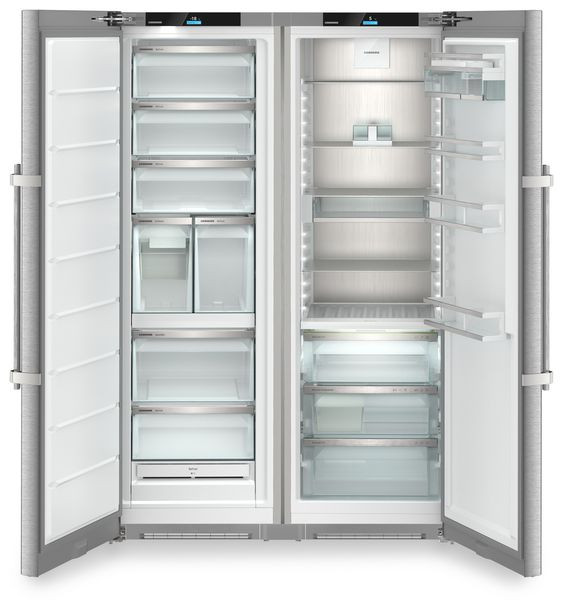 Side-by-Side Set (auch als Einzelgeräte nutzbar), Rauminhalt Kühlen: 384 l, davon Frische-Zone: 138,4 l, BioFresh, Umluftkühlung, Flaschenablage (liegend), Frische-Behälter: 3, Glasablageflächen: 4, VarioSafe (Kleinere Lebensmittel, Packungen, Tuben und Gläser sind in diesem Schubfach optimal aufbewahrt), LED-Beleuchtung, Rauminhalt Gefrieren: 278 l, BigBox [XXL]: 1, Schubladen: 6, VarioSpace (einzelne Gefrierschubfächer herausnehmbar, für extra hohen Stauraum), NoFrost, LED-Beleuchtung, Eisbereiter für Eiswürfel, Display, farbig, 2,4 Zoll, 6,1 cm, Touch-Funktion, digitale Temperaturanzeige, Kühl-/Gefrierteil getrennt regelbar, SmartDevice integriert (Steuerung über Internetverbindung möglich), per App unterstützter Datentransfer, per App steuerbar, Energieeffizienzklasse D, Made in Germany, Breite: 119,4 cm, Höhe: 185,5 cm, Tiefe: 67,5 cm