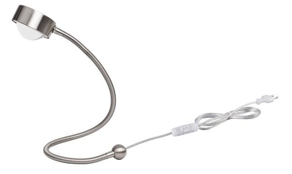 Kreativ einsetzbare titanfarbene LED-Leuchte zum Aufhängen, zum Umwickeln an Streben und Balken oder zum Aufstellen. Steckerfertig vormontiert. Biegsamer, selbst fixierender Metall-Lamellenschlauch mit Kugelabschluss (66 cm Länge) und 150 cm langem Anschlusskabel (transparent) mit Zwischenschalter. Gerichtete Beleuchtung durch LIGHTME POWERLENS LED-Leuchtmittel mit hochwertiger Echtglas-Linse für Lichtfächer mit 60° Abstrahlwinkel, lichtstark durch 350 lm Leuchtenlichtstrom, warmweiße Lichtfarbe (2700 K) für Wohnräume geeignet, nachhaltig und werkzeuglos wechselbar durch Bajonettfassung GX53.