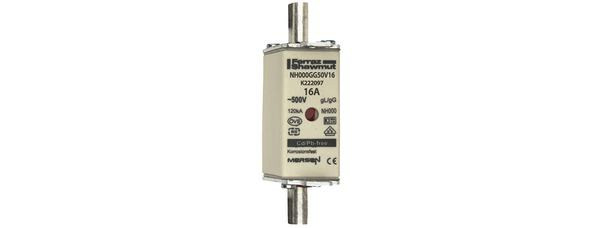 | Kurzbeschreibung | Sicherungseinsatz NH gG Gr.000 AC500V DC250V 16A mit spannungsführenden Grifflaschen sfü und Doppelkennmelder |