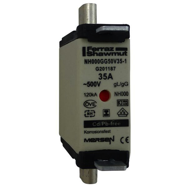 | Kurzbeschreibung | Sicherungseinsatz NH gG Größe 000 AC500V DC250V 35A mit spannungsfreie Grifflaschen SGL und Doppelkennmelder |