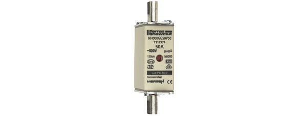 | Kurzbeschreibung | Sicherungseinsatz NH gG Gr.000 AC500V DC250V 50A mit spannungsführenden Grifflaschen sfü und Doppelkennmelder |