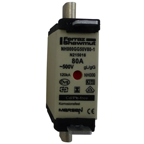 | Kurzbeschreibung | Sicherungseinsatz NH gG Größe 000 AC500V DC250V 80A mit spannungsfreie Grifflaschen SGL und Doppelkennmelder |
