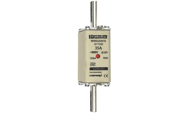 | Kurzbeschreibung | Sicherungseinsatz NH gG Gr.0 AC500V DC250V 35A mit spannungsführenden Grifflaschen sfü und Doppelkennmelder |