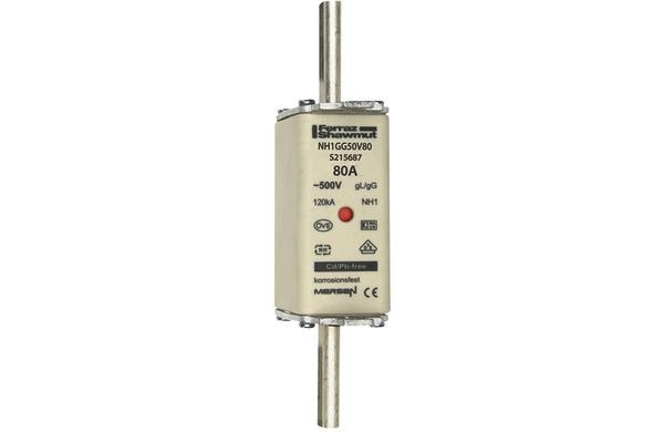 | Kurzbeschreibung | Sicherungseinsatz NH gG Gr.1 AC500V DC250V 80A mit spannungsführenden Grifflaschen sfü und Doppelkennmelder |
