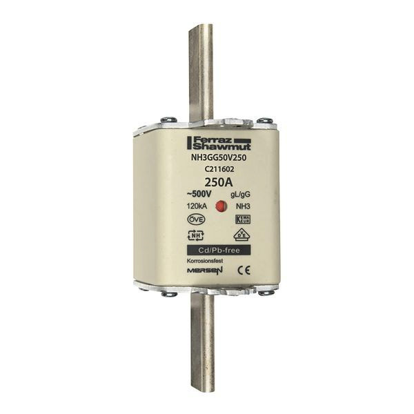 | Kurzbeschreibung | Sicherungseinsatz NH gG Gr.3 AC500V DC250V 250A mit spannungsführenden Grifflaschen sfü und Doppelkennmelder |