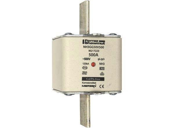 | Kurzbeschreibung | Sicherungseinsatz NH gG Gr.3 AC500V DC250V 500A mit spannungsführenden Grifflaschen sfü und Doppelkennmelder |