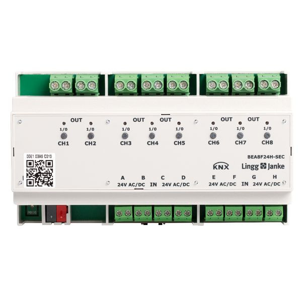 KNX eco+ Binär Ein-/Ausgang 8-fach Signaleingang 24V AC/DC Handbedienung 9 TE Schaltleistung 16A 250 VAC C-Last 200µF