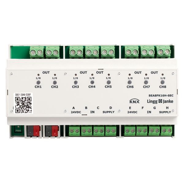 KNX eco+ Binär Ein-/Ausgang 8-fach Kontaktabfrage Handbedienung 9 TE Schaltleistung 16A 250 VAC C-Last 200µF