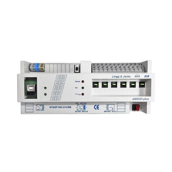 KNX standard Netzteilaktor 6-fach USB Handbedienung 2. Generation 12 TE Schaltleistung 16A 250 VAC C-Last 200µF
