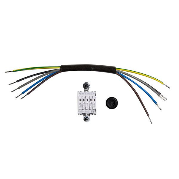 Anschluss-Set mit Erdung, Befestigung in Profilboden über Hammerschrauben, Verbindungsklemme 5-polig mit Anschlussleitungen L1/L2/L3/N/PE zur Weiterverdrahtung an LichteinsätzeAnschluss-Set mit Erdung, Befestigung in Profilboden über Hammerschrauben, Verbindungsklemme 5-polig mit Anschlussleitungen L1/L2/L3/N/PE zur Weiterverdrahtung an Lichteinsätze
