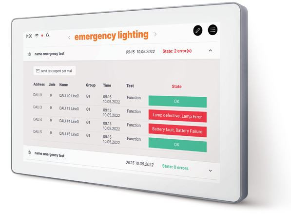 Multifunktionales Bediengerät für DALI Notlichtsysteme - 7 Zoll kapazitiver Touchscreen mit 24-Bit Farbtiefe - Dimensionen: 178 x 111 x 8 mm - Adressierung und Inbetriebnahme des DALI Notlichtsystems - Konfiguration von DALI Notlichtgruppen - Einfache Überwachung und Kontrolle über das Notlichtsystem - Planung und Automatisierung von Kommunikations-, Funktions- und Betriebsdauertests - Automatische Protokollierung und E?Mail-Versand von Prüfberichten - Multimasterfähig: es können mehrere Bediengeräte gemeinsam mit einem Notlicht Display in einem DALI-Kreis verwendet werden - Einfache Installation: Montage an einer Unterputzdose - Versorgung über 24V oder Power Over Ethernet POE - Version mit zusätzlichen Funktionen des DALI-2 Display Plus zur Steuerung des DALI Systems verfügbar Art.Nr.: 86456840-P-EM-W bzw. Art.Nr.:86456840-P-EM-B (für zusätzliche Funktionen siehe DALI-2 Display Datenblatt)