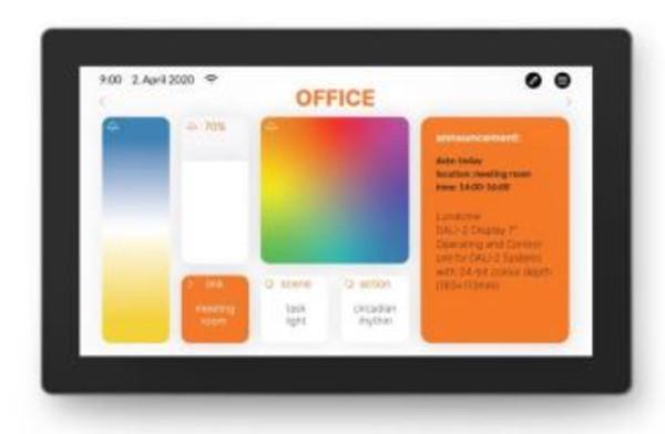 Das kapazitive 7? Display mit 24 bit Farbtiefe erlaubt sowohl die Inbetriebnahme, als auch die Steuerung und Bedienung eines DALI Systems. Über zahlreiche Widgets kann die Anzeige individuell gestaltet werden. Zur Verfügung stehen zum Beispiel Dimmen und Schalten von Gruppen und Einzeladressen, RGB Farblichtmanagement, Farbtemperatursteuerung. Als Schnittstellen stehen DALI und WLAN zur Verfügung. Auch die Messung von Temperatur, Feuchtigkeit, Luftdruck, Luftqualität etc. ist über integrierte Sensoren möglich.