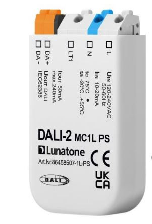 Kompaktes DALI-2 Steuermodul mit 1 Schalteingang für Netzspannung, Version mit integrierter DALI Busversorgung (50mA), galvanische Trennung zwischen Schalteingang und DALI-Interface, Multimasterfähig (mehrere Module können auf derselben DALI-Linie installiert werden), integrierter DALI-2 Application Controller ermöglicht neben den Standard DALI Befehlen auch DALI DT8, Tunable White und RGB(W) Steuerung sowie Macros, das Modul besitzt eine DALI-2 Instanz (Typ Pushbutton, entsprechend IEC62386-301) zur einfachen Integration