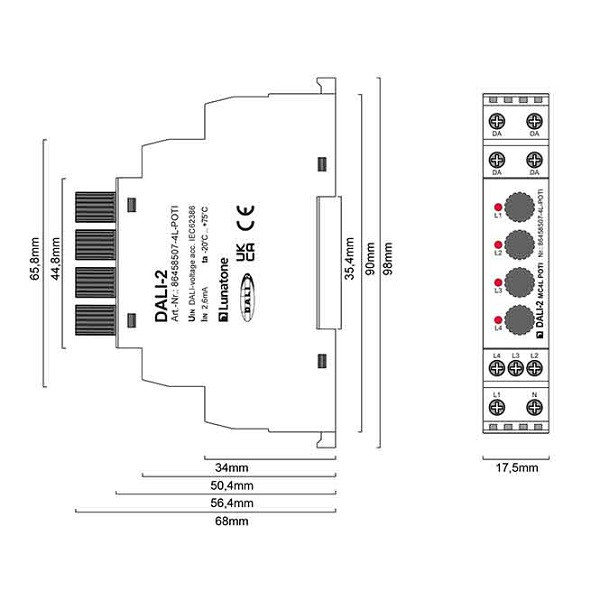 DALI-2 Steuergerät mit vier frei programmierbaren Schalteingängen für Netzspannung Und 4 Potentiometern zur direkten Helligkeit Einstellung - 4 Potentiometer zur Einstellung des Lichtlevels - LED Anzeige der aktiven Eingänge - Hutschienen Montage - das Gerät wird über den DALI Bus versorgt Technische Daten: Eingänge für: Schalteingang für Netzspannung Anzahl der Eingänge: 4 Kennzeichnung Eingangs-Klemmen: L1, L2, L3, L4, N Eingangsspannung: 230Vac Eingangsspannungstoleranz: +20% / -25% Frequenz Eingangsspannung: 50Hz 60Hz / DC Transport- und Lagertemperatur: -20 bis +75 Grad Celsius Betriebstemperatur: -20 bis +75 Grad Celsius rel. Luftfeuchte, nicht kondensierend: 15% 90% Isolationsdaten: Impulsspannungskategorie: II Verschmutzungsgrad: 2 Bemessungsisolationsspannung: 250V Bemessungsstoßspannung: 4kV