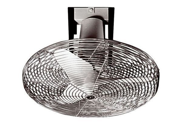 Oszillierender Industrieventilator für Decken- oder Wandmontage. 3-blättriges Flügelrad aus Kunststoff, Farbe perlweiß, mit Schutzkorb nach DIN EN 294, mit thermischem Überlastungsschutz, feuchtschutzisoliert, wartungsfrei. Maximal zulässige Umgebungstemperatur +40 °C.