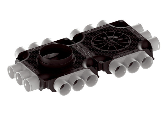 <p> - Flacher und kompakter doppelter Luftverteiler aus recyclebarem Kunststoff für 18 x Flexrohre DN 63, Zuleitung DN 180. Geeignet für flexible und platzsparende Montagemöglichkeiten.</p><p> - Flacher Luftverteiler bestehend aus: 3 Verschlussdeckel DN 200, 1 Anschlussübergang DN 180, 1 Enddeckel DN180, 18 Dichtringe DN 63, 18 lösbare Sicherungs-Klammern DN 63 zum Befestigen der Flexrohre, 14 Verschlussdeckel DN 63.</p><p> - Farbe anthrazit (Korpus) mit weiß/leicht transparenten Anschlussstutzen.</p><p> - Mit Einsteck-Sichtkontrolle für passgenauen und kontrollierten Flexrohr-Einschub.</p><p> - Einsatz als 90°-Verteiler, bzw. auch als Durchgangsverteiler möglich mit optionalem Zubehör (s. Anschlussübergang).</p><p> - Druckstabil zum Einbetonieren in Filigran-Geschossdecke.</p><p></p><p>Artikel:</p><p>MA-FDV18-63</p><p> - Einbauort: Decke / Wand / Fussboden</p><p> - Material: Polypropylen (PP)</p><p> - Farbe: Anthrazit</p><p> - Gewicht: 3,1 kg</p><p> - Gewicht mit Verpackung: 3,95 kg</p><p> - Anschlussdurchmesser: 180 mm</p><p> - Anschlussdurchmesser Flexrohr: 63 mm</p><p> - Anzahl Anschlussstutzen: 18</p><p> - Geeignet für Nennweite: 63 mm</p><p> - Breite: 445 mm</p><p> - Höhe: 80 mm</p><p> - Tiefe: 772 mm</p><p> - Breite mit Verpackung: 485 mm</p><p> - Höhe mit Verpackung: 135 mm</p><p> - Tiefe mit Verpackung: 806 mm</p>