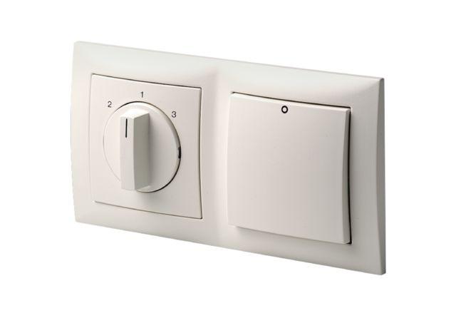 Dreistufige Raumluftsteuerung für Abluftventilator ER 100 D, Raumluftsystem WRG 300 EC, WRG 400 EC und Abluftsystem ZEG 2000. 3 Schaltstufen: Grund-, Normal-, Volllast (Drehknopf). Mit separatem, 2-poligem Ein-/Ausschalter (Wippenschalter). Beide Schalter im gemeinsamen Doppelrahmen. Abmessung B x H x T: 150 x 80 x 32 mm, Einbaulage: senkrecht ; waagerecht
