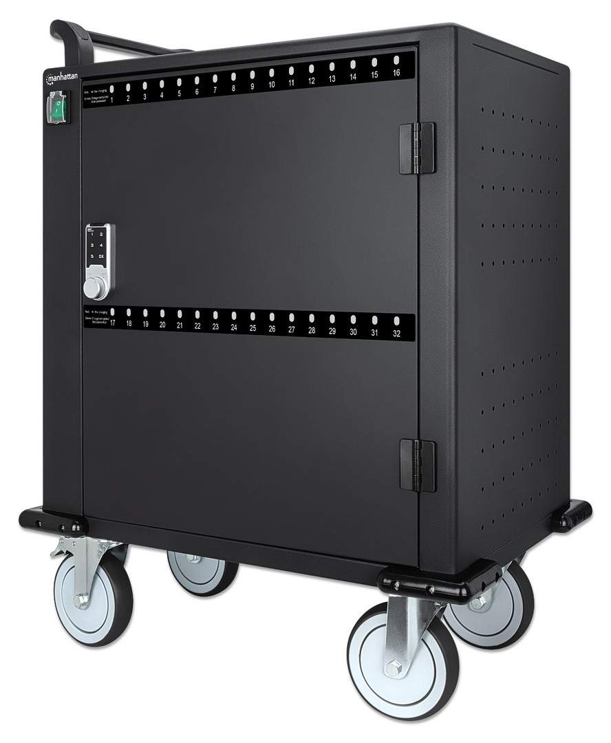Sicherer Lagerplatz und Schnellladestation für bis zu 32 Smartphones, Tablets und andere USB-Geräte bis zu 14" USB-C Power Delivery (PD 3.0) Ladeports mit Ausgangsleistung bis zu 18 W/3 A pro Port und 576 W gesamt Schutz vor Überladung, Überspannung, Kurzschluss, Spannungsspitzen und Blitzschlag Robustes, sicheres, pulverbeschichtetes Metallgehäuse, abschließbar per PIN-Code Geräumige Trennfächer (jeweils 330 x 22 x 235 mm) mit integrierten Kabelführungen Rückseitig ein zusätzlicher 2,1 A/5 V USB-A-Port und zwei EU CEE 7/3-Steckdosen für externes Laden Integrierter Lüfter und Perforation für effiziente Kühlung und maximalen Luftdurchsatz Robuster Griff aus Edelstahl und vier Rollen, davon zwei mit Arretierung Status-LEDs für einfache Übersicht Universeller C20-Stromanschluss, C19 auf CEE 7/4 EU-Stromkabel im Lieferumfang, kann bei Bedarf durch regionale Versionen ausgetauscht werden Ideal zur Verwendung mit Manhattan USB-C-Ladekabeln, z. B. #356213 oder #354868 3 Jahre Garantie