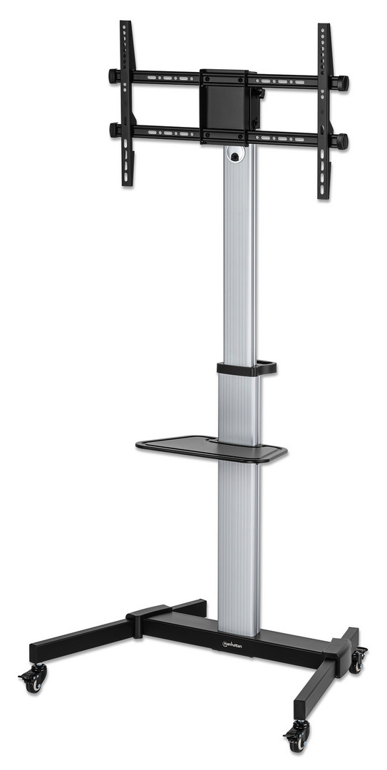 Für Bildschirme von 37" bis 86" und bis zu 50 kg, -10 bis 5° neigbar, 90° rotierbar, Fachboden für Laptop oder AV-Zubehör, silber/schwarzMultifunktionaler Trolley / TV-Ständer auf Rollen für Fernseher von 37" bis 86" und bis zu 50 kg -10 bis 5° werkzeuglos neigbar für optimalen Betrachtungswinkel 90° rotierbar für Displayausrichtung im Hoch- oder Querformat Höhenverstellbar von 1200 bis 1600 mm Höhenverstellbarer Fachboden für Laptop/AV-Zubehör mit 260 x 400 mm Fläche und Traglast bis zu 5 kg Aluminiumkonstruktion in Premiumqualität mit Pulverbeschichtung Integrierter Kabelkanal für aufgeräumte Optik Vier feststellbare Rollen mit robuster Polyurethan-Lauffläche für Mobilität und hohe Traglast Griff an Halterungsstange für einfaches und bequemes Manövrieren Entspricht VESA-Standards 200x200 bis 600x400 z. B. 200x200, 300x200, 400x200, 300x300, 400x300, 400x400, 600x400 10 Jahre Garantie