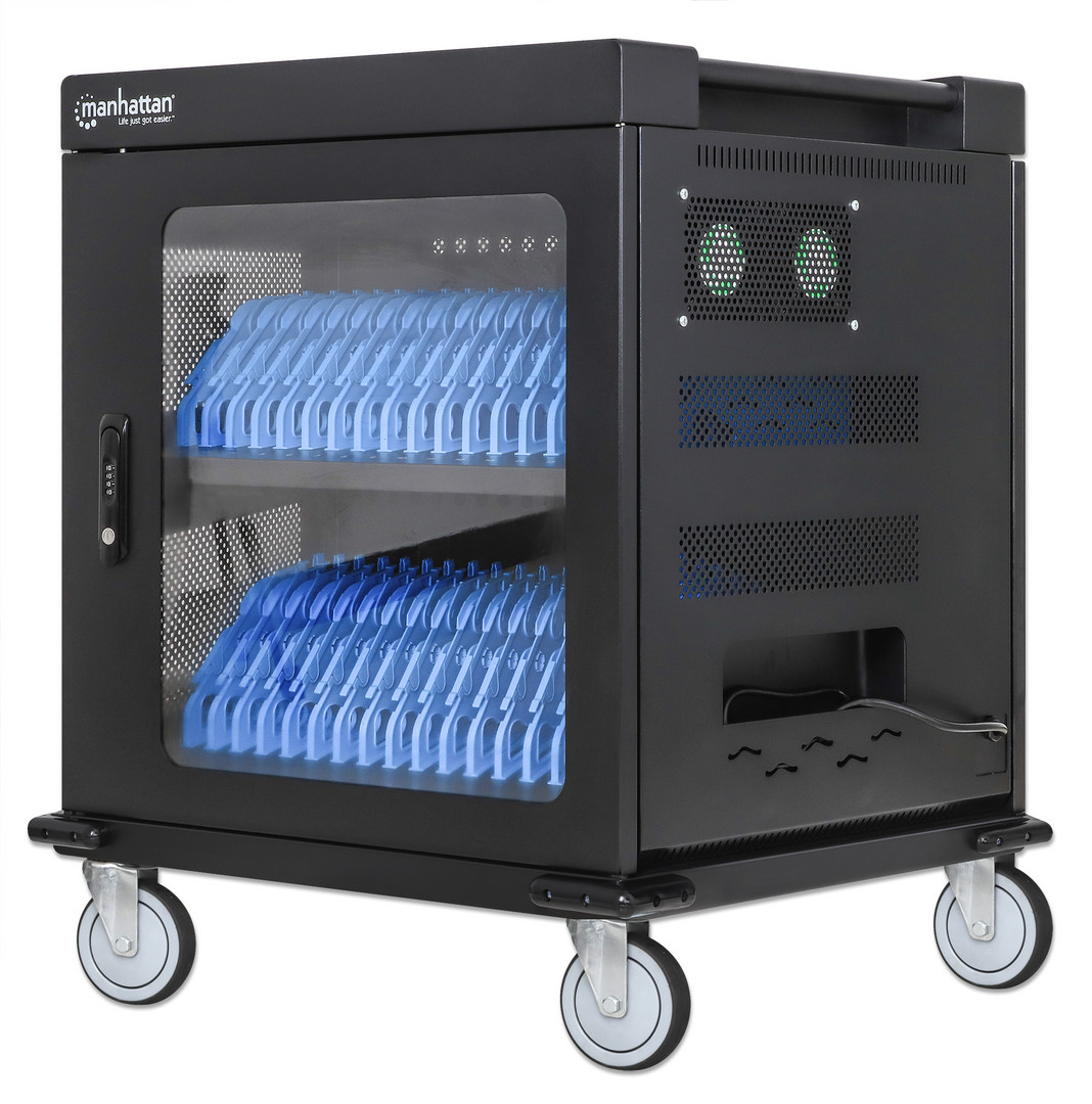 Sicherer Lagerplatz und Ladestation für Laptops und andere Geräte bis zu 15,6" 32 EU CEE 7/3-Steckdosen in rückseitig montierten Steckdosenleisten Smartes Strommanagement-System verhindert Überlastung Schutz vor Überladung, Überspannung, Kurzschluss und Spannungsspitzen Stahltür mit Sichtfenster aus Sicherheitsglas auf der Frontseite Robustes, sicheres, pulverbeschichtetes Metallgehäuse, 3-Punkt-Schloss an Front- und Rückseite, abschließbar mit zwei beiliegenden Schlüsseln oder vierstelliger Zahlenkombination Geräumige Trennfächer (jeweils 400 x 25 x 280 mm) mit integrierten Kabelführungen Integrierter Lüfter und perforierte Seitenwände für effiziente Kühlung und maximalen Luftdurchsatz Robuster Griff und vier abnehmbare Schwerlastrollen Abgerundete Ecken vermeiden Verletzungen in hektischen Umgebungen Erdungskit im Lieferumfang Universeller C14-Stromanschluss, Stromkabel mit C13 auf EU-Stecker im Lieferumfang Keine Ladegeräte oder Ladekabel im Lieferumfang (separat erhältlich von Manhattan) 3 Jahre Garantie