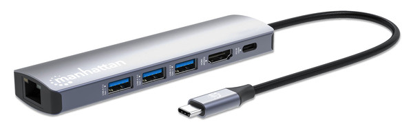 Schließt Ihren Laptop an Monitor, Netzwerk und Peripherie an und lädt Ihre Geräte Ein HDMI-Port mit Auflösungen bis zu Ultra-High-Definition (UHD) 4K@60Hz (3840×2160) Ein Gigabit Ethernet-Port (10/100/1000 Mbit/s) für Downloads, Streaming und Gaming in Highspeed Lädt Ihren Laptop mit USB Power Delivery (PD) bis zu 100 W; benötigt externes PD-Ladegerät - erhältlich von Manhattan Drei USB 3.2 Gen 1 Typ A-Ports (USB 3.0) mit SuperSpeed-Übertragungsraten bis zu 5 Gbit/s und Geräteladung bis zu 4,5 W (5 V / 0,9 A) USB-A-Ports zum Anschluss von Mäusen, Tastaturen, USB-Sticks und mehr sowie zum Laden und Synchronisieren von mobilen Geräten Kompatibel mit allen USB-C DP-Alt-Mode-unterstützten PCs, Notebooks und Tablets, einschließlich Apple MacBook®, Chromebook™, Pixel™ und mehr Konform mit DisplayPort 1.4 Alternate Mode (DP Alt Mode) Ermöglicht die Verwendung Ihres Smartphones als Desktop-PC und lädt gleichzeitig dessen Akku (Desktop-Anzeige erfordert Geräte mit Android 9 oder höher mit Videoausgabe über USB-C) Robustes, schlankes Aluminiumgehäuse, für Schreibtisch und unterwegs gleichermaßen geeignet Plug & Play-Installation; kompatibel mit Windows®, macOS®, Chrome OS™ und Android™ Integriertes 20 cm Kabel mit vergossener Aluminiumtülle und Stoffummantelung Kompatibel mit den Schnittstellen USB4® und Thunderbolt™ 3 / 4 Vollständig HDCP 2.3-konform, abwärtskompatibel 3 Jahre Garantie