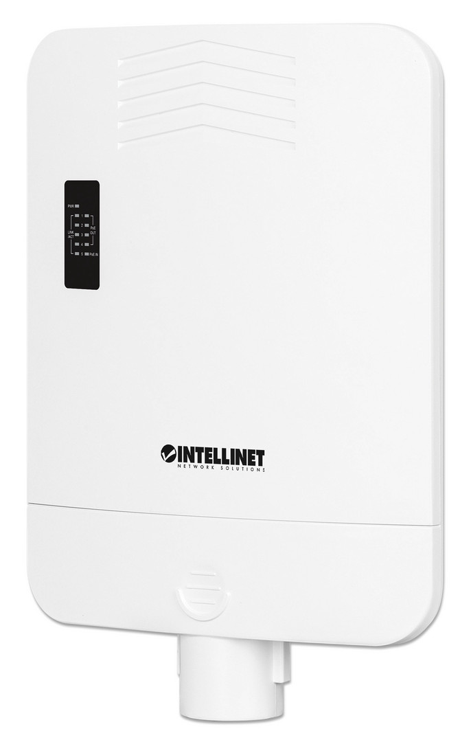 Ein IEEE 802.3bt (PoE++ / 4PPoE) PD PoE-Port mit bis zu 90 W Eingangsstrom, vier IEEE 802.3at/af-konforme PSE PoE-Ports, wetterfest per IP65, zur Wand- und Mastmontage, erhöht PoE-Reichweite um 100 m