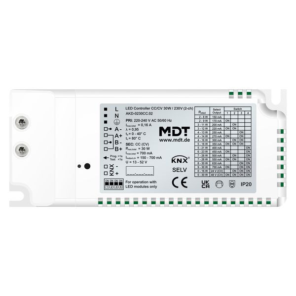 KNX LED Controller CC/CV 30 W / 230 V 2-Kanal. Ausführung mit integriertem Netzteil in kompakter Bauform. Konstantstrom LED-Controller mit max. Ausgangsstrom von 700 mA. Optimierte Hybrid-Dimmung für eine bessere Lichtqualität. Dimmbereich von 0,2 % ... 100 %, Mindeststrom 0,7 mA. Perfektes Dimmverhalten über den gesamten Dimmbereich. Maximale Ausgangsleistung: 30 W über beide Kanäle. Ausgangsstrom max. 700 mA. Konstantstrom wählbar über DIP-Schalter. Konstantspannungsbetrieb mit 24 V oder 48 V. Tunable White Farbtemperatursteuerung. Wählbare Dimmkurve, individuelle Sequenzen. Betriebsarten: 2x Weiß oder 1x Tunable White. Automatische Farbtemperatursteuerung Dim2Warm. Dynamische Tageslichtsteuerung HCL (Human Centric Lighting). Automatisches uhrzeitabhängiges Dimmen. Überstrom- und Temperaturüberwachung. Integriertes Netzteil in kompakter Bauform. Sekundäre Anschlussleitung bis zu 6 m. Abmessungen (H x B x T): 54 x 129 x 25 mm. 3 Jahre Produktgarantie.
